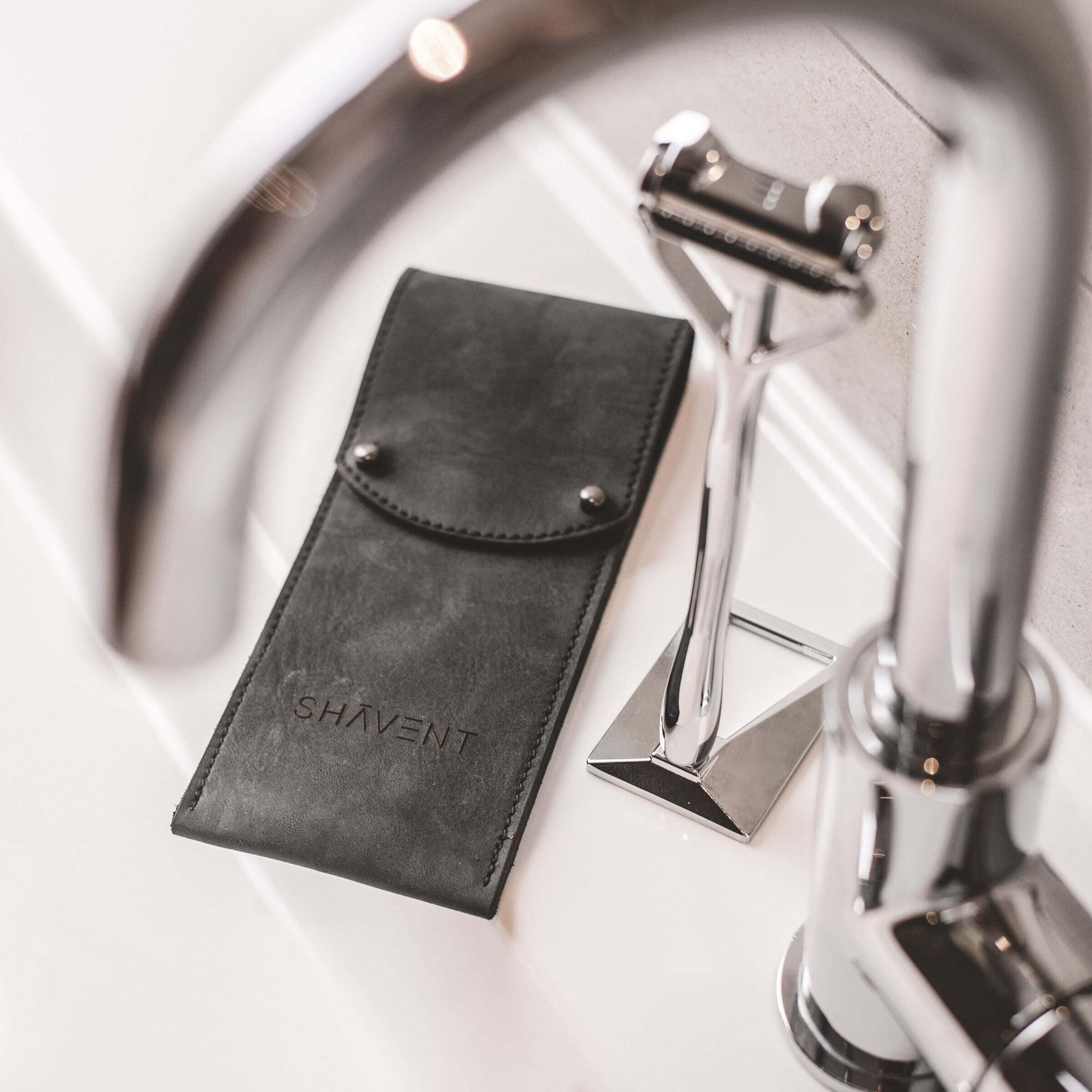 Die perfekte Reisetasche und Aufbewahrung für den SHAVENT Rasierer aus hochwertigem, langlebigem, lokal produziertem Leder.